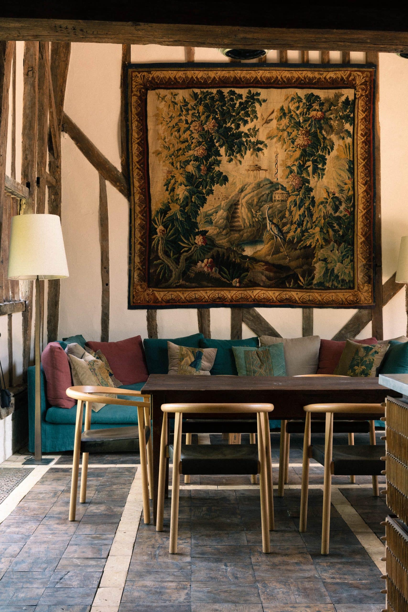 In the same project, verdure tapestries like the one below features strongly in the opposite end of this kitchen above this generous teal sofa. Tapestries like this are an excellent choice for historic buildings with uneven walls and lots of beams. Often woven entirely from wool, they also bring depth to spaces.