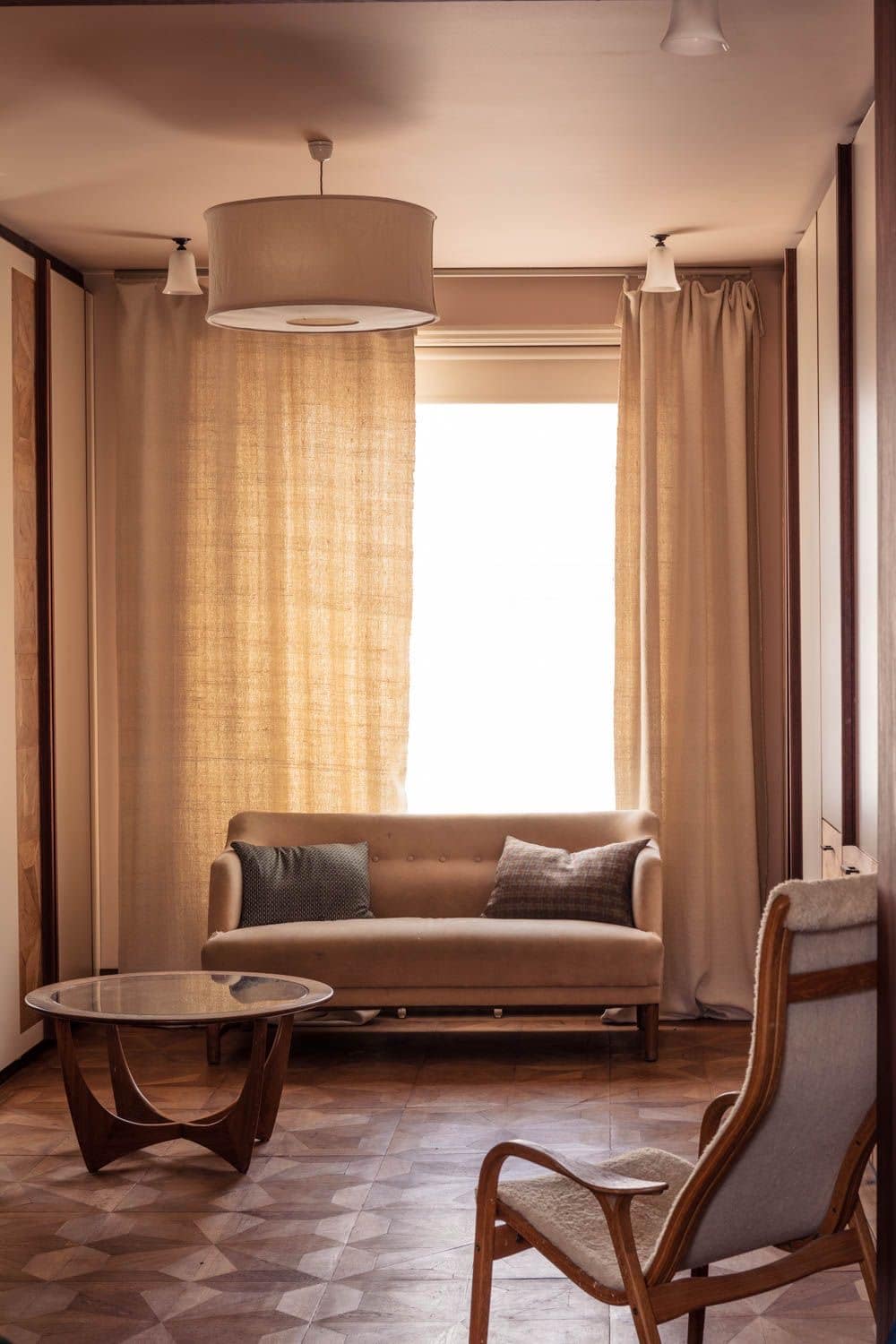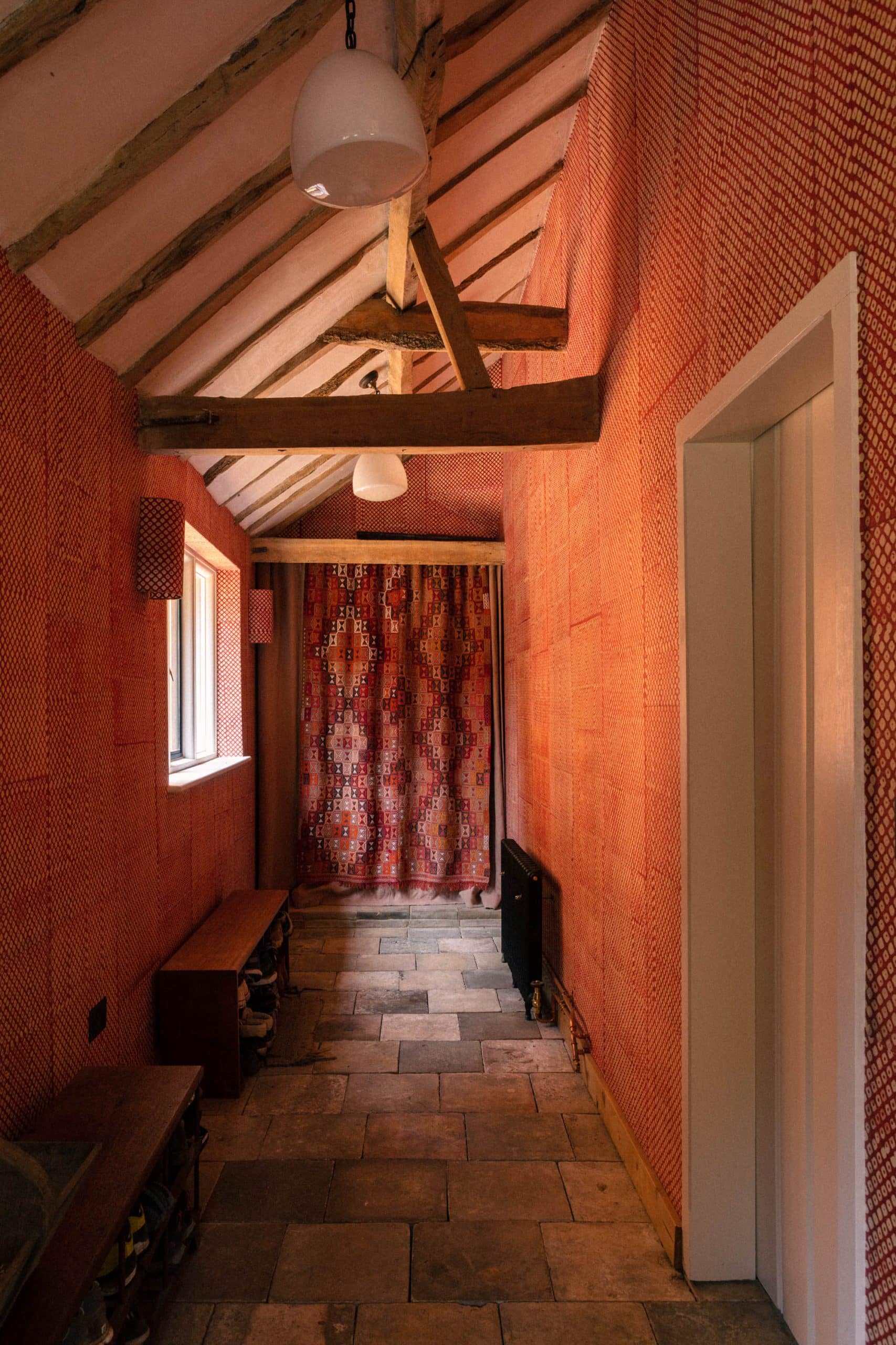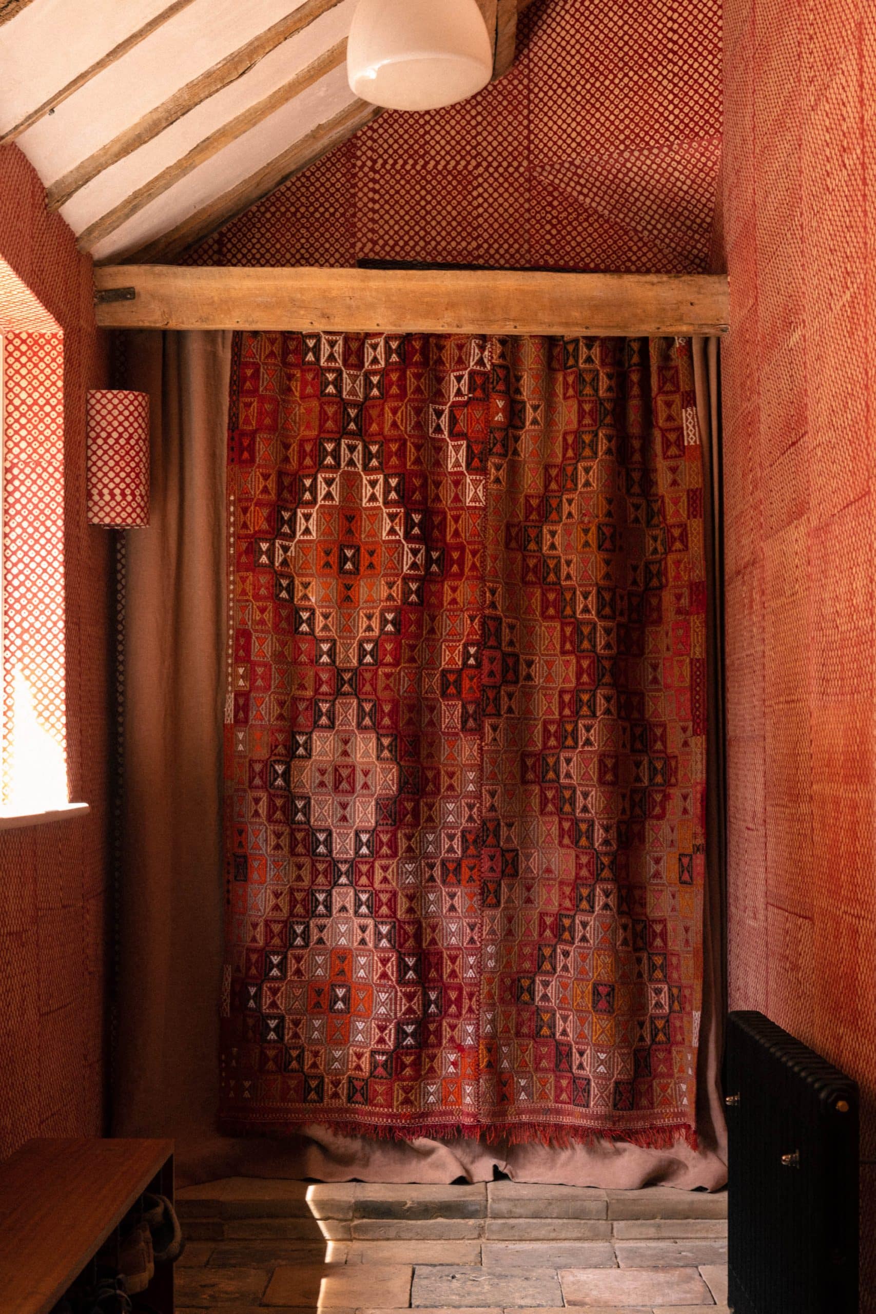 Sustainable, renewable and biodegradable, wool is a material that not only enriches interiors but also respects the environment. For us, its a reminder that natural fibres are not a trend but a timeless investment – bringing character, depth and beauty to a space. In this entranceway for example in our Suffolk farmhouse project, (more on this in this article by House & Garden), we used this striking geometric vintage wool rug as a curtain – bringing warmth and colour to this space – a fitting reminder how it speaks to the enduring beauty of natural materials and the craft that shapes them.