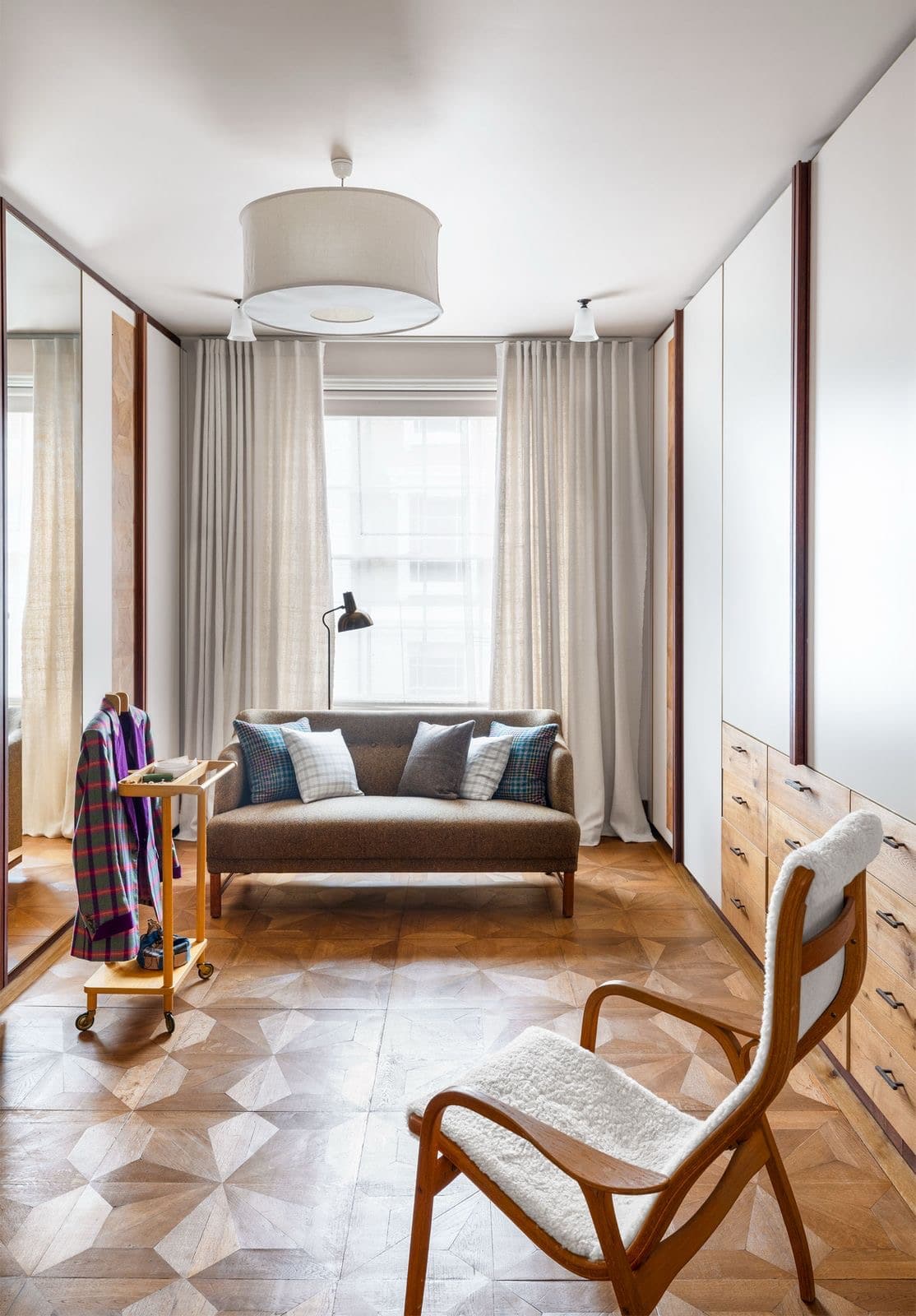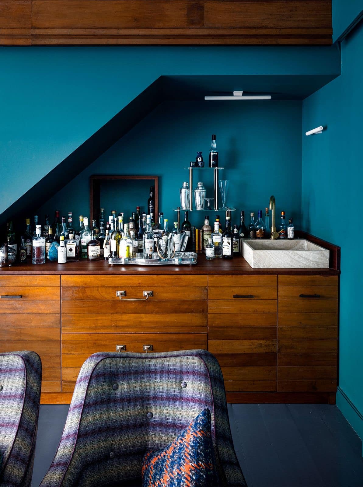 In this project for the owner of Dashing Tweeds – a company specializing in Scottish tweeds, we incorporated the company’s own fabric into the interiors. A vintage sofa which found its home in the dressing room was upholstered in a Dashing Tweed, while bolder colour choices feature in the chairs and pillow within the bar area (photos below are taken from this article in Elle Decor which features the project more extensively). Some more pictures from this project can be found in this post.