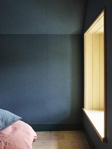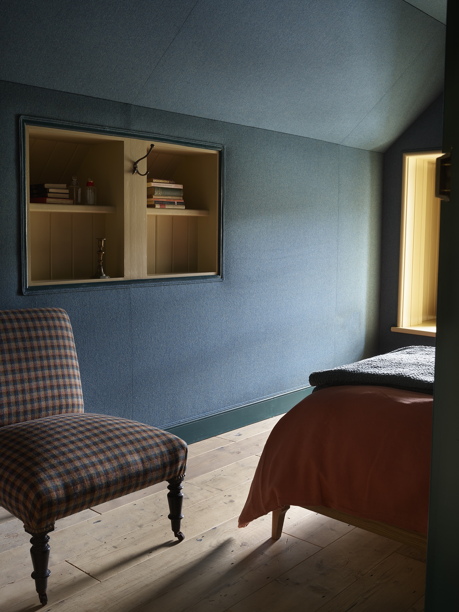 In one of Rodel House’s bedrooms, we upholstered the walls in a deep blue Harris Tweed. The padded wool finish brings warmth and acoustic softness, while connecting the building to its heritage and to the craftmanship that continues to sustain island life.